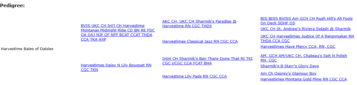 Sire: (Revere) UKC Intl CH Harvestime Montanas Midnight Ride CD BN RE FDC OA OAJ NJP OF NFP BCAT CCA THD CGCA TKA SR93435201